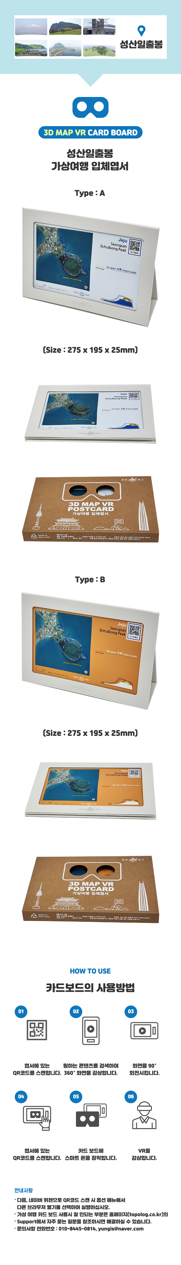제주 성산일출봉 지역의 수치지형도 데이터를 축소해서 만든 입체 엽서로 엽서의 QR코드를 스캔하면 가상체험을 즐길수 있는 상품입니다.