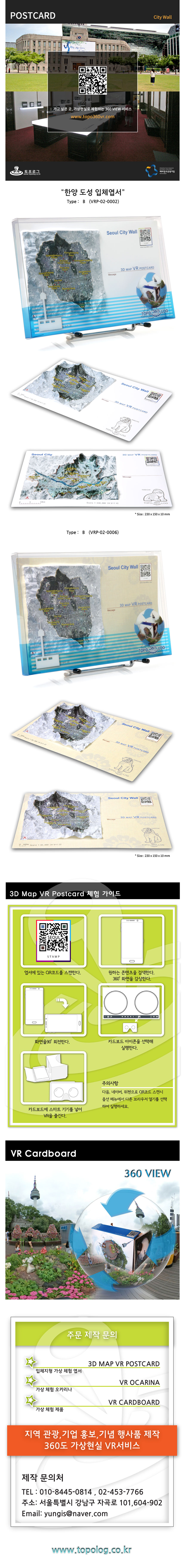 한양도성지역의 수치지형도 데이터를 축소해서 만든 입체 엽서로 엽서의 QR코드를 스캔하면 가상체험을 즐길수 있는 상품입니다.